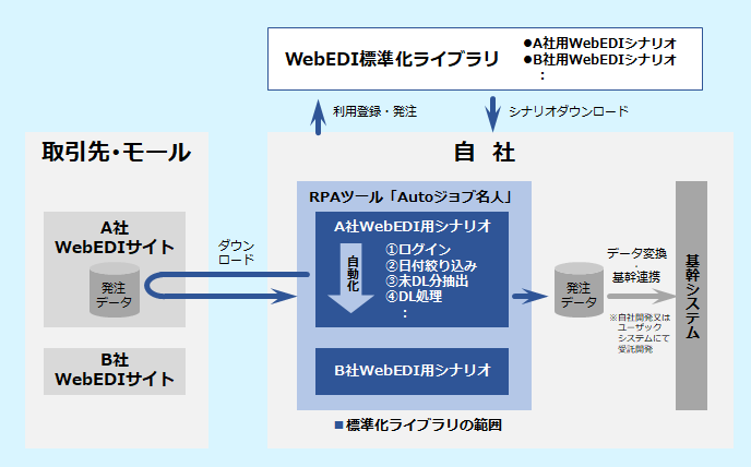 〇標準化ライブラリ 「標準化ライブラリ」は、WebEDIを自動化するためのシナリオをダウンロードいただくサービスです。登録済みのシナリオであればイチから開発する必要なくすぐにご利用いただくことが可能となっております。未登録のシナリオについても標準化可能な範囲で随時追加登録を行っていく予定です。登録済みのシナリオは、BACREXやChainFlow、インフォマート、FINETなど多数。イチからシナリオを開発するより、はるかにクイック&ローコストでWebEDIを実現できます。 |