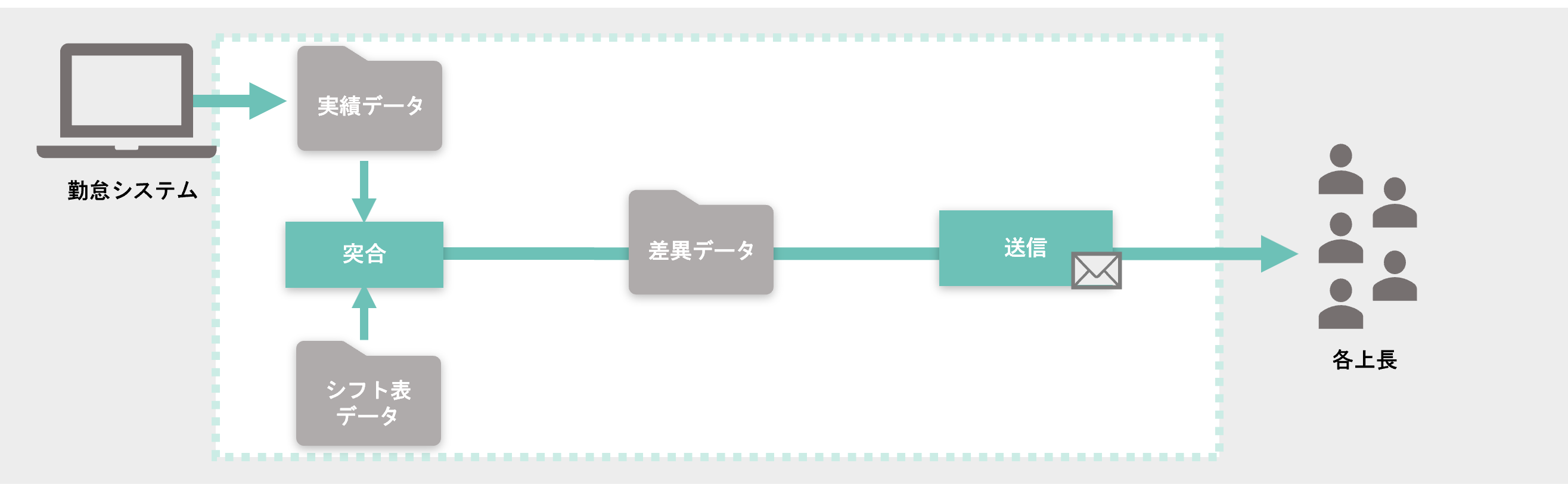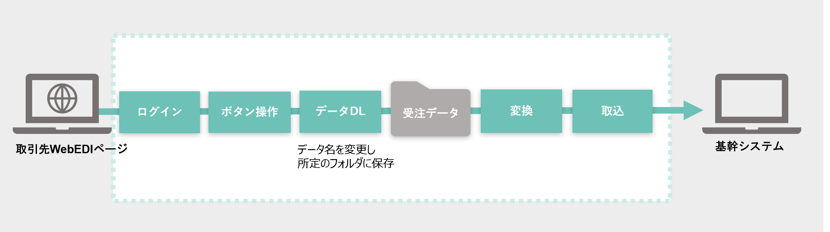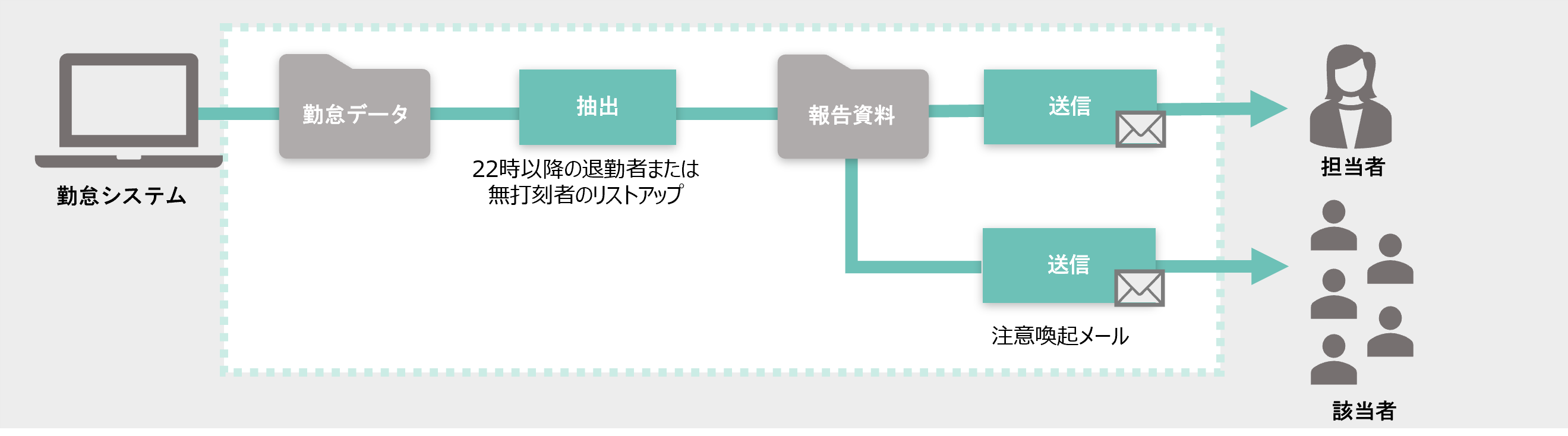 1.退社から翌日の出社までが10時間以下の方と無打刻者をリストアップし 該当者に注意喚起メールを、担当者にリストを送信。 ➡ 約555分/月かかっていた作業が0秒に!!!2.アルバイトのシフト予定と勤怠実績を照合し、差異を各上長に報告 ➡ 30人×21日分のデータ処理が0秒に!!!3.WebEDIから受注データをダウンロードし、基幹システムに取込 ➡ 約30時間/月の作業が0秒に!!! |